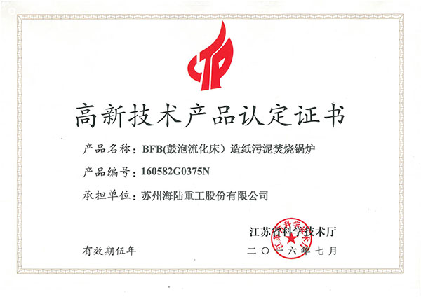 近日,公司收到江蘇省科學(xué)技術(shù)廳頒發(fā)的高新技術(shù)產(chǎn)品認(rèn)定證書(shū), 我公司的研制BFB(鼓泡流化床)造紙污泥焚燒鍋爐獲省高新技術(shù)產(chǎn)品認(rèn)定。該產(chǎn)品主要用于造紙廠處理污泥工藝流程中,將造紙污泥干化后摻煤燃燒,解決污泥廢物處置問(wèn)題,同時(shí)對(duì)污泥焚燒過(guò)程產(chǎn)生的熱量進(jìn)行回收,產(chǎn)生次高壓蒸汽用于發(fā)電或造紙工藝循環(huán)利用,實(shí)現(xiàn)了環(huán)境污染治理與資源循環(huán)利用并舉。