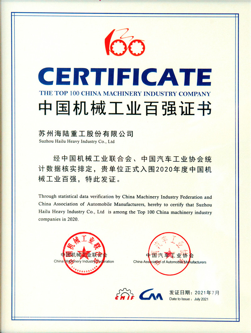蘇州海陸重工股份有限公司榮獲“中國機(jī)械工業(yè)百強(qiáng)企業(yè)”榮譽(yù)稱號(hào)